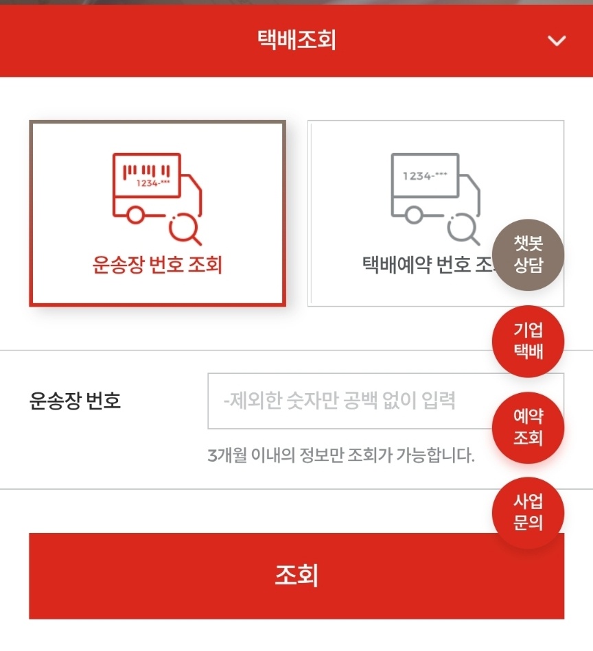 송장번호 입력 후 '조회하기' 버튼을 누르면 집화-터미널도착-배송출발-배송완료 단계별 진행상황과 예상 배송일시를 실시간으로 확인할 수 있습니다.